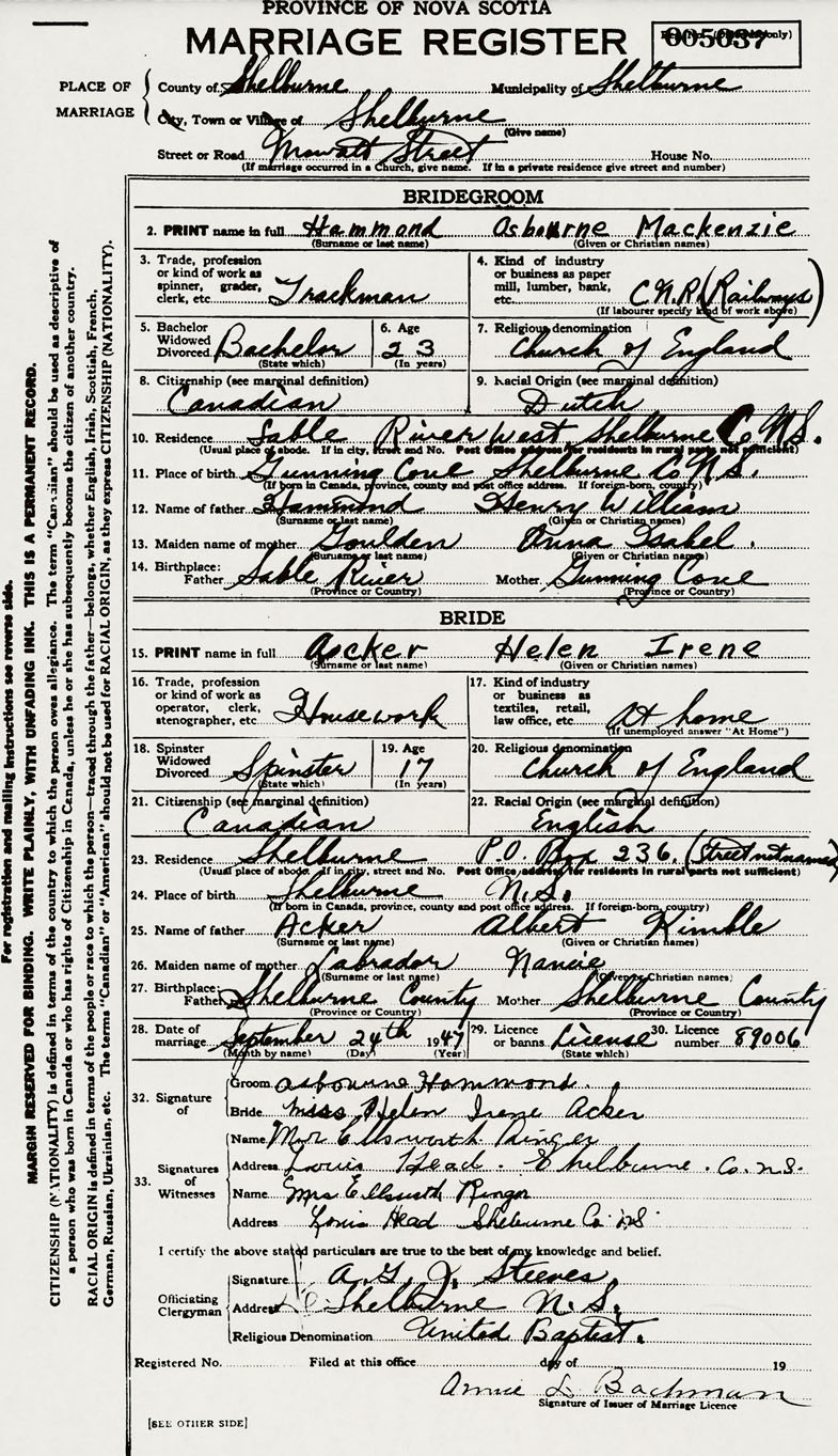 11. Place of birth Gunning Cove, Shelburne County Nova Scotia