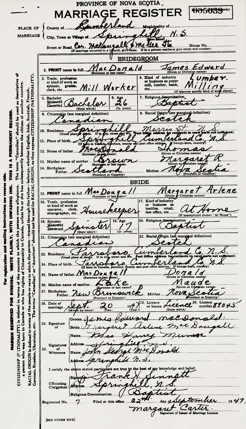 28. Date of marriage September 20 1947 29. By license or banns License 30. License number 89045