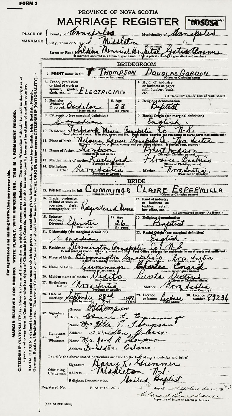 28. Date of marriage September 23 1947 29. By license or banns License 30. License number Licence 89236