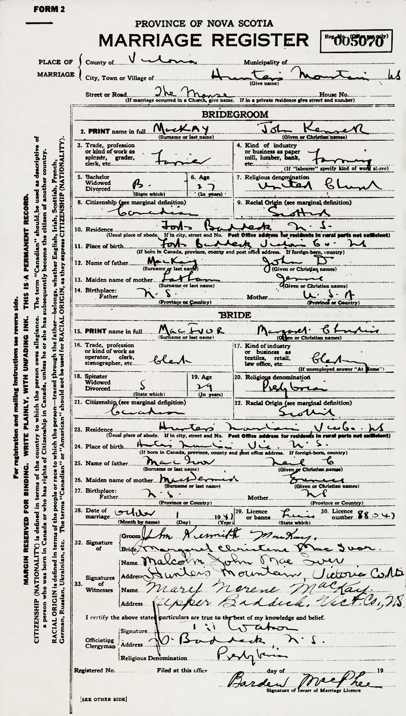 24. Place of birth Hunters Mountain, Vic., Nova Scotia