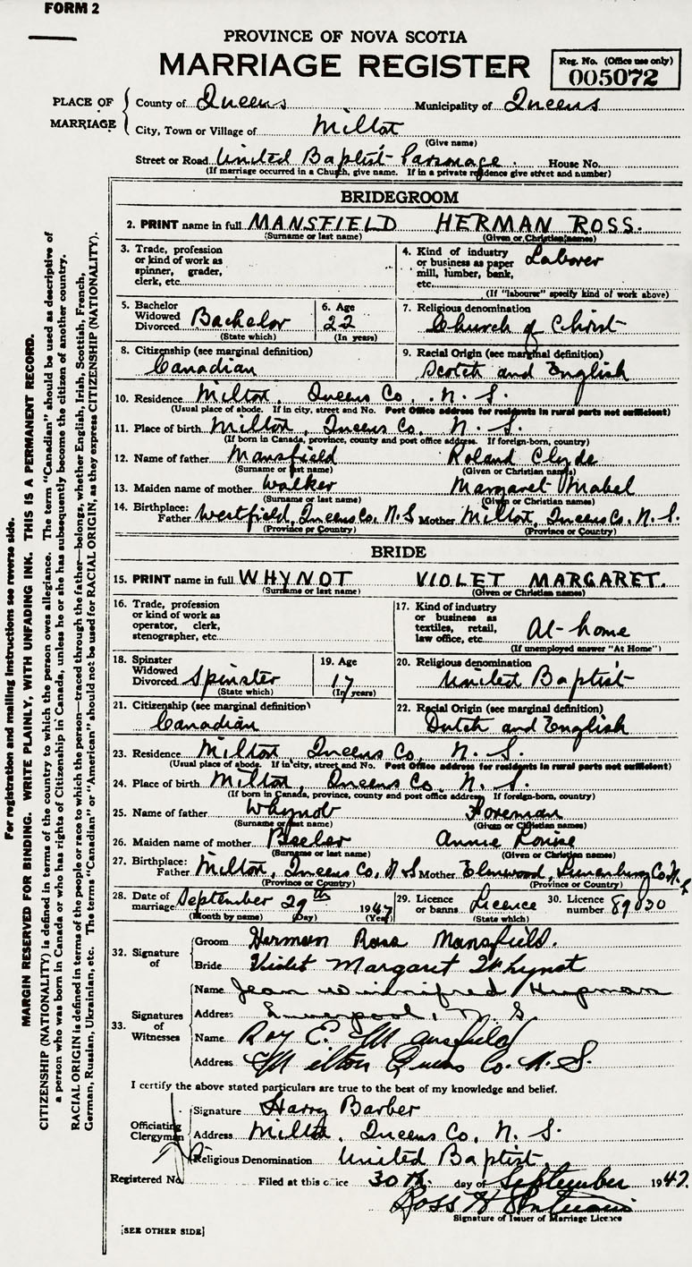 27. Birthplace Father Milton, Queens County, N S Mother Elmwood, Lunenburg County, Nova Scotia