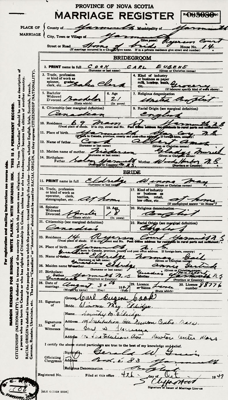 28. Date of marriage August 30 1947 29. By license or banns License 30. License number 88776