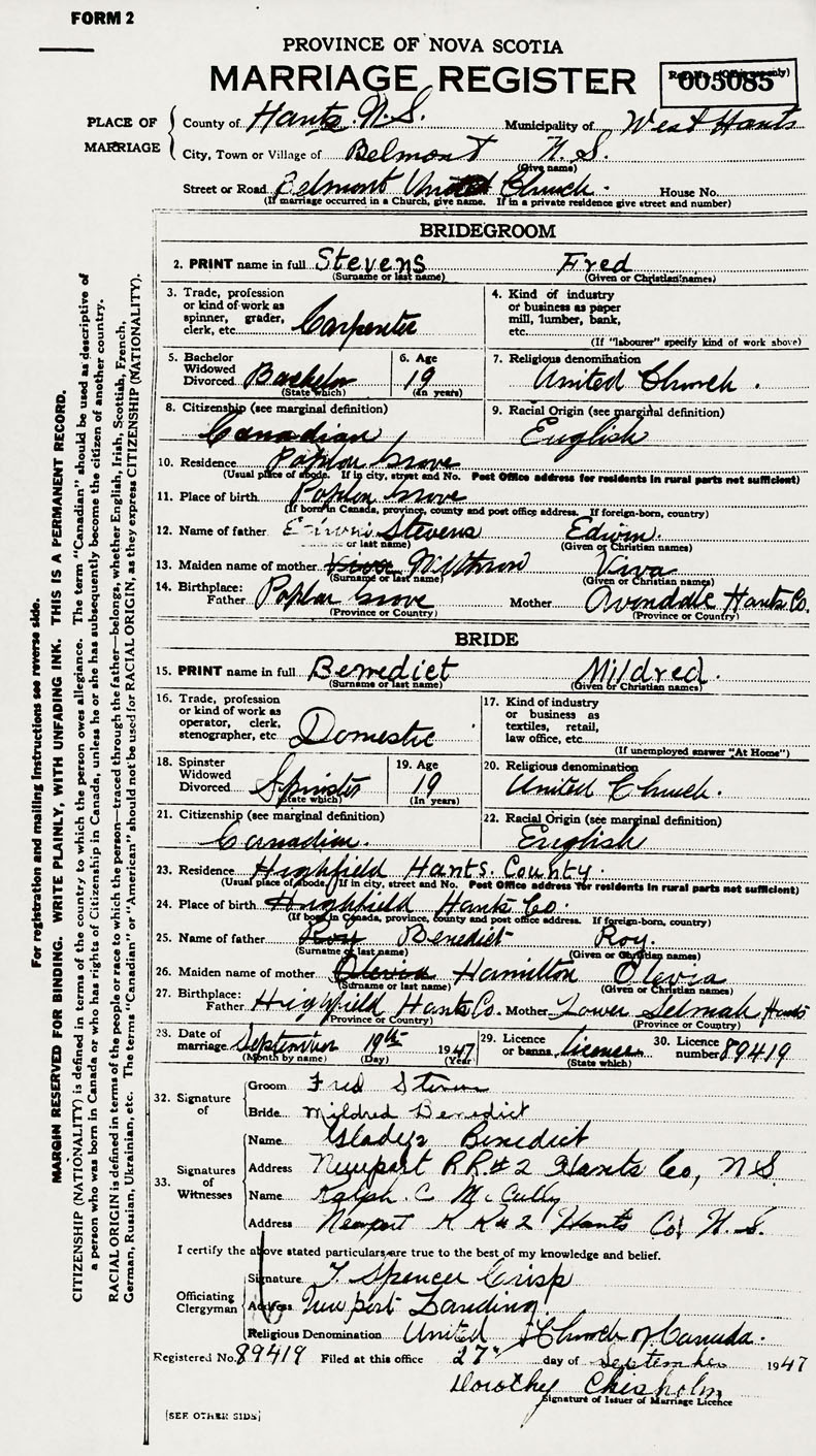 28. Date of marriage September 19 1947 29. By license or banns License 30. License number 89419