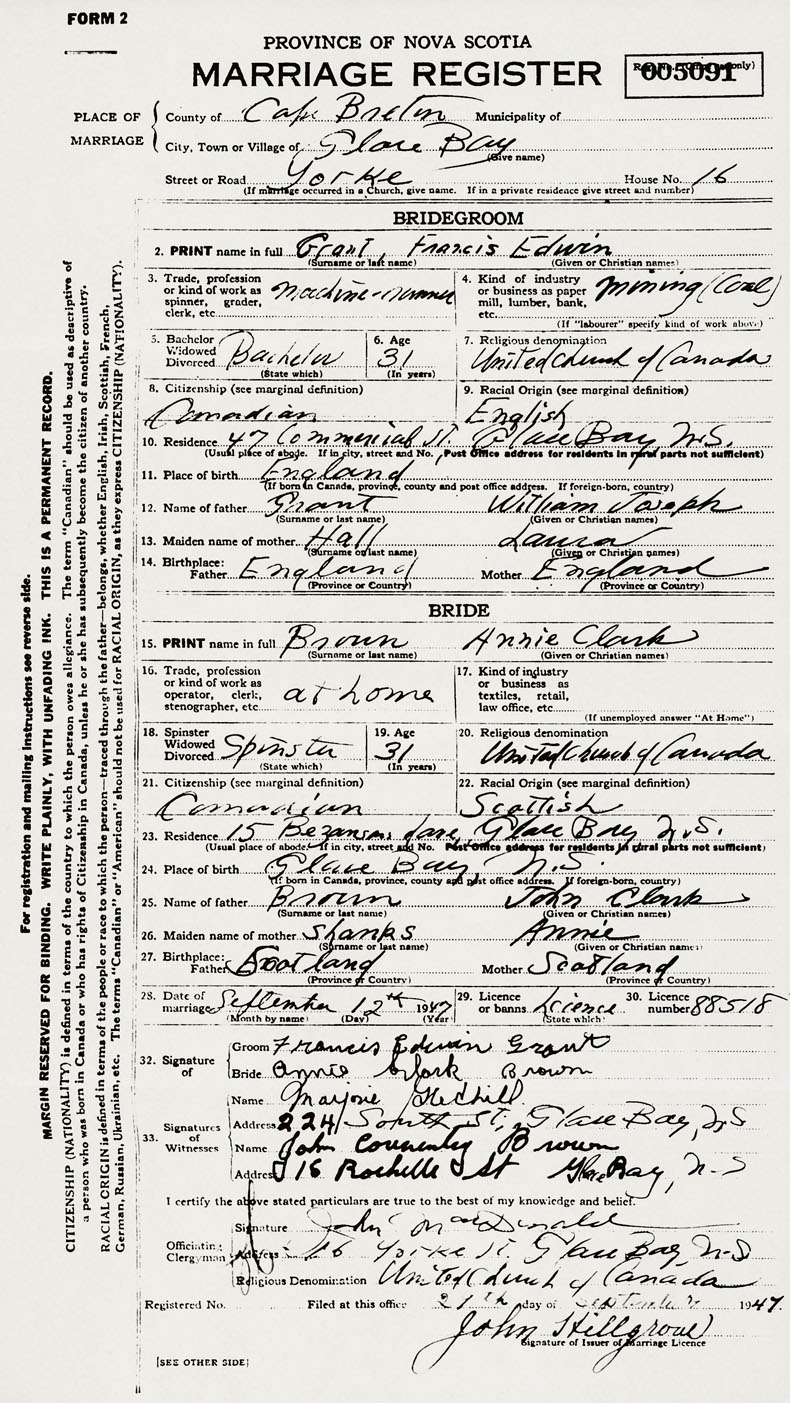 28. Date of marriage September 12 1947 29. By license or banns License 30. License number 88518