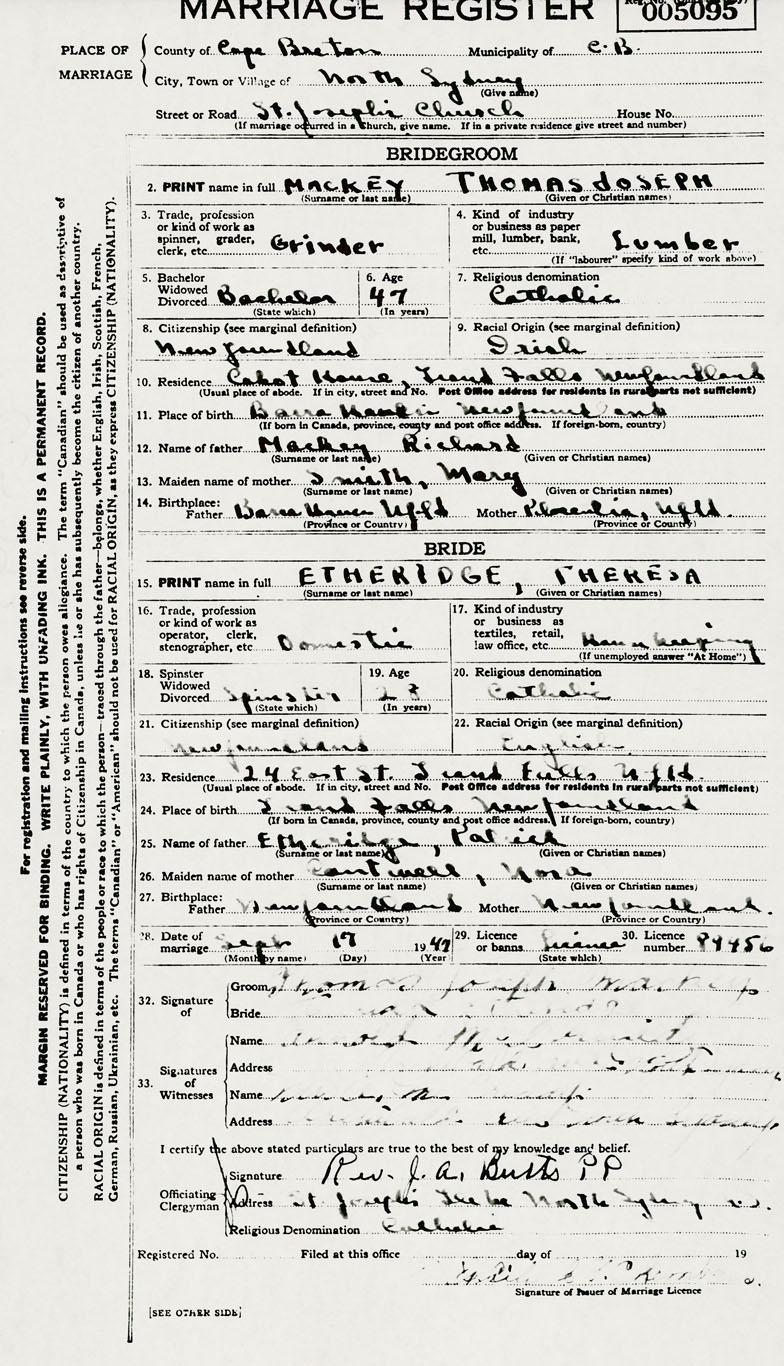 14. Birthplace Father Barra Haven, Nfld Mother Placentia, Nfld