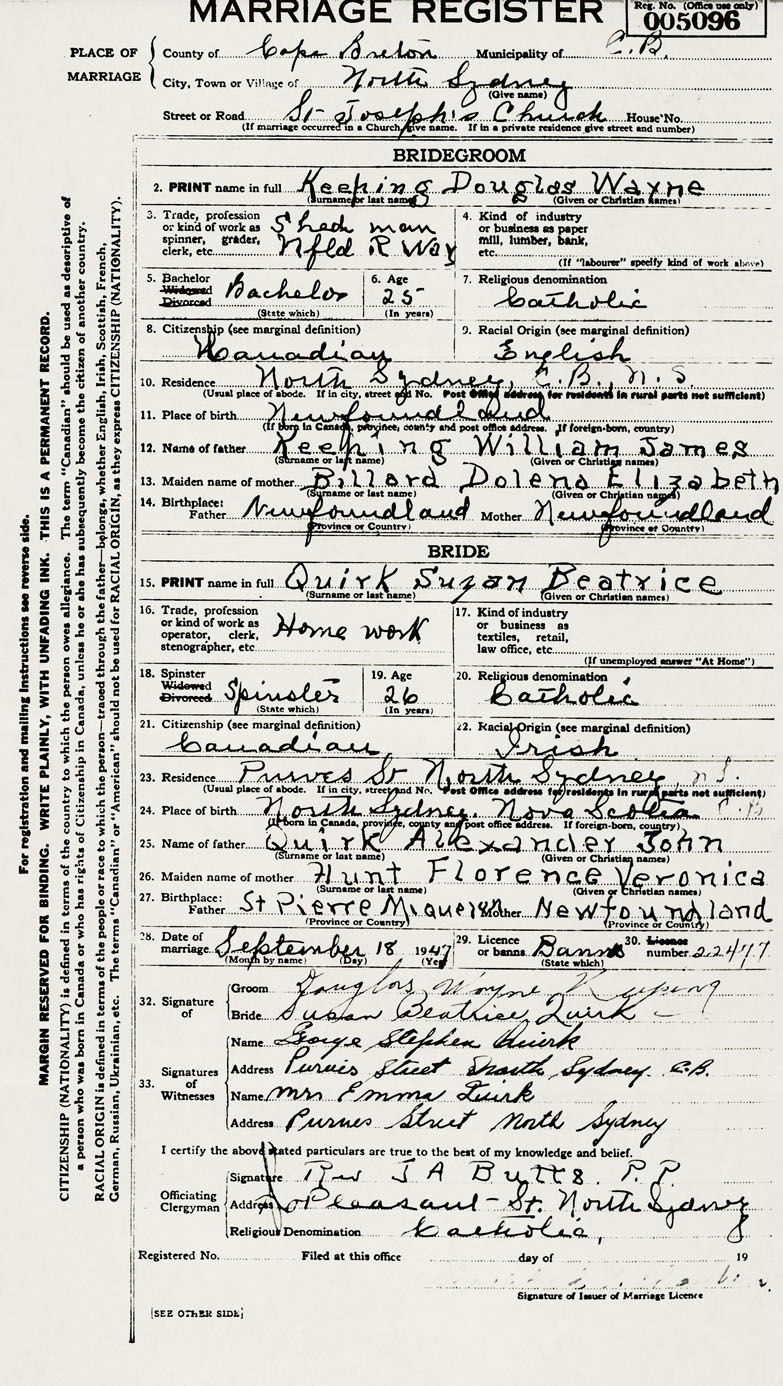 28. Date of marriage September 18 1947 29. By license or banns License 30. License number 22477