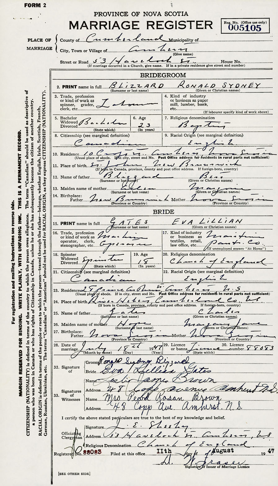 28. Date of marriage July 18 1947 29. By license or banns License 30. License number 88083