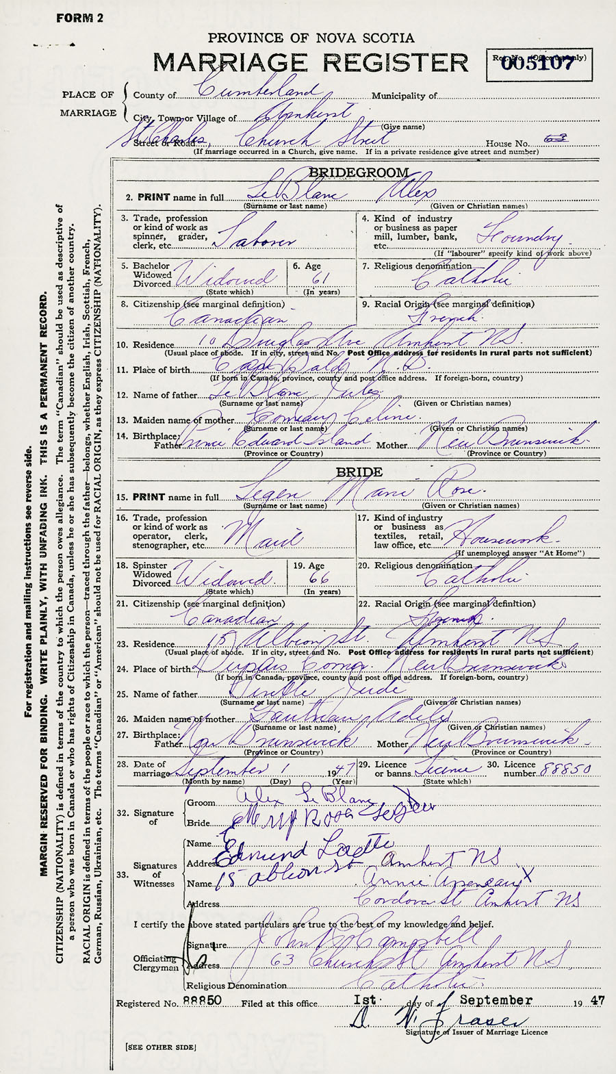 28. Date of marriage September 1 1947 29. By license or banns License 30. License number 88850