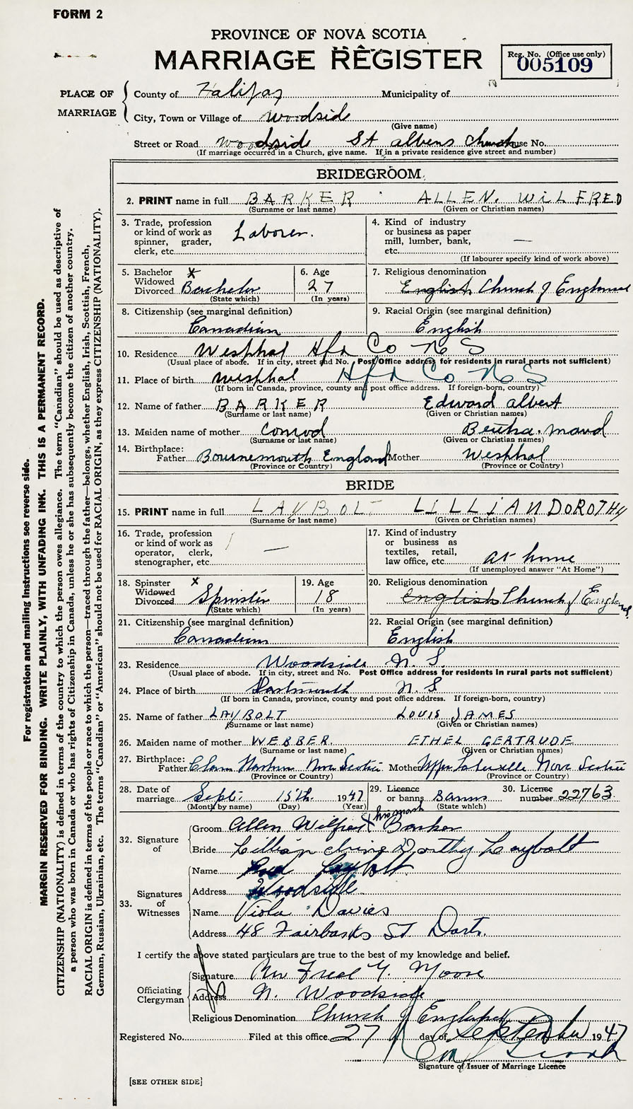 28. Date of marriage September 15 1947 29. By license or banns License 30. License number 22763