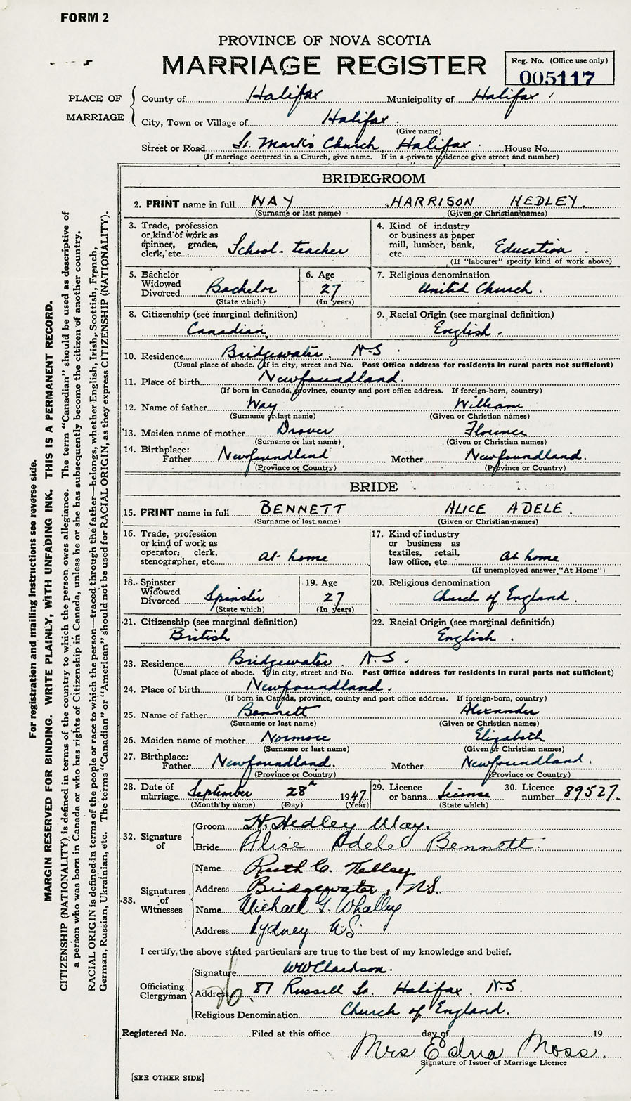 28. Date of marriage September 28 1947 29. By license or banns License 30. License number 89527