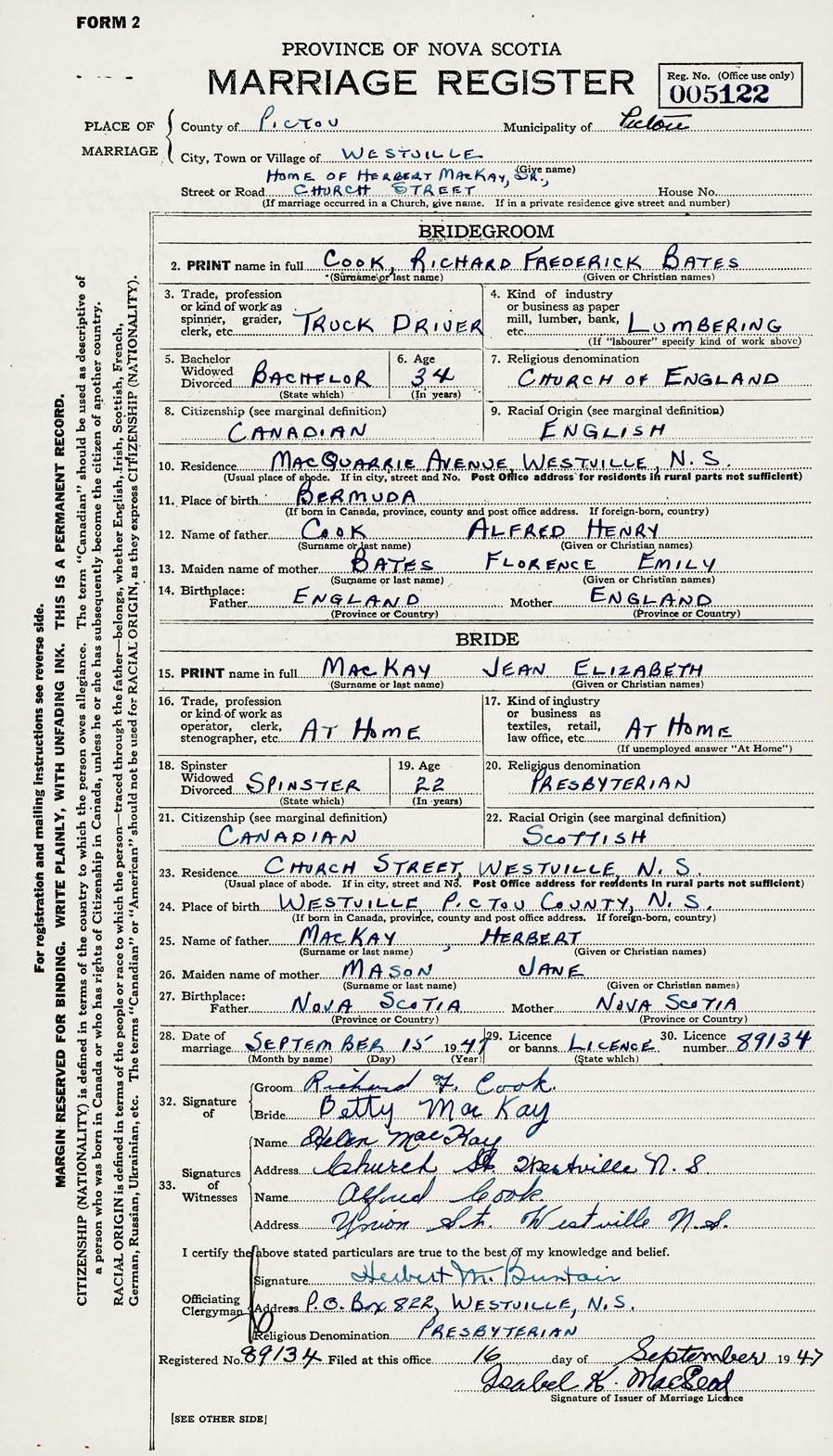 24. Place of birth Westville, Pictou County, Nova Scotia