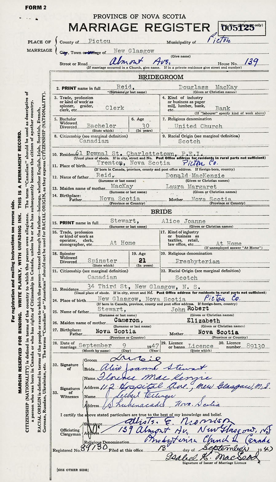 28. Date of marriage September 9 1947 29. By license or banns License 30. License number 89130