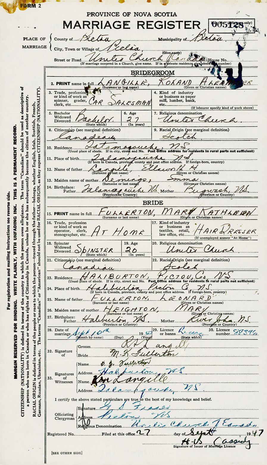 28. Date of marriage September 10 1947 29. By license or banns License 30. License number 88396