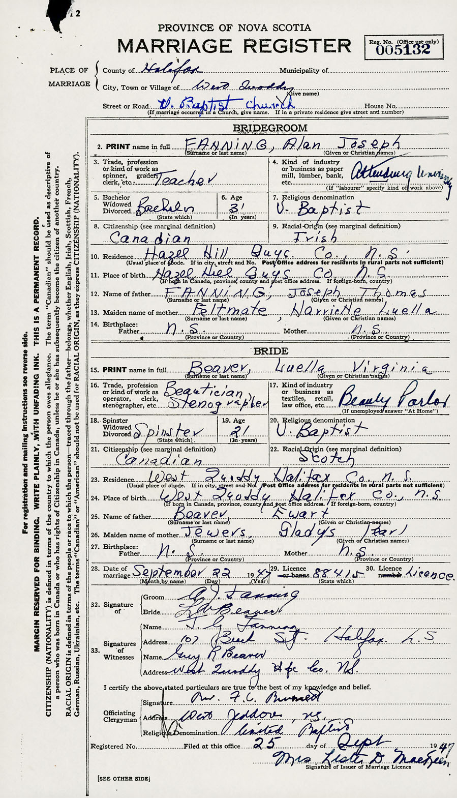 28. Date of marriage September 22 1947 29. By license or banns License 30. License number 88415