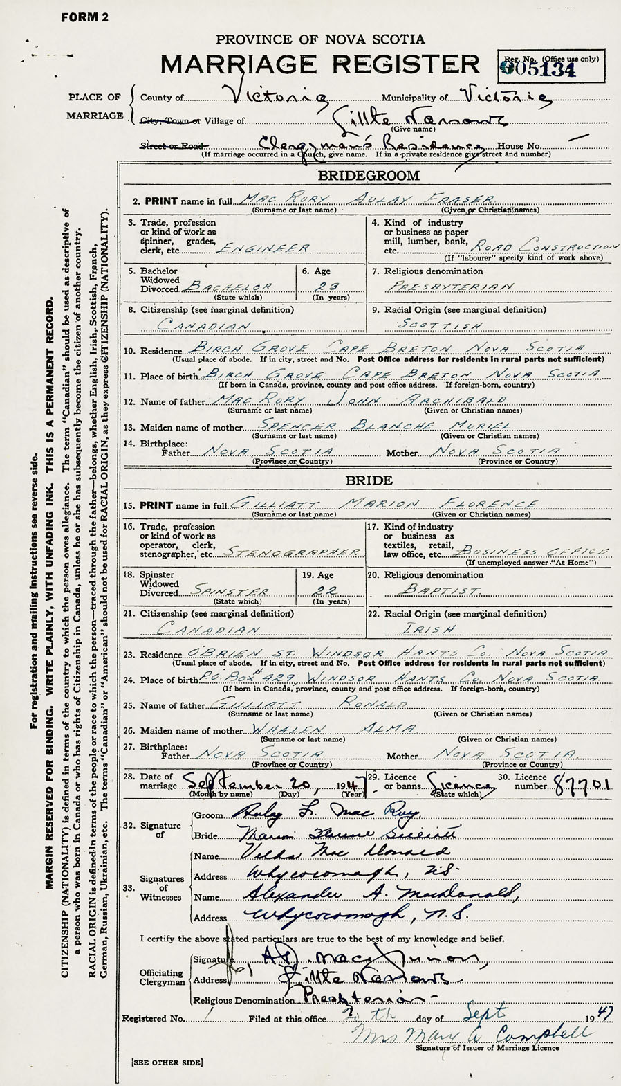 28. Date of marriage September 20 1947 29. By license or banns License 30. License number 87701