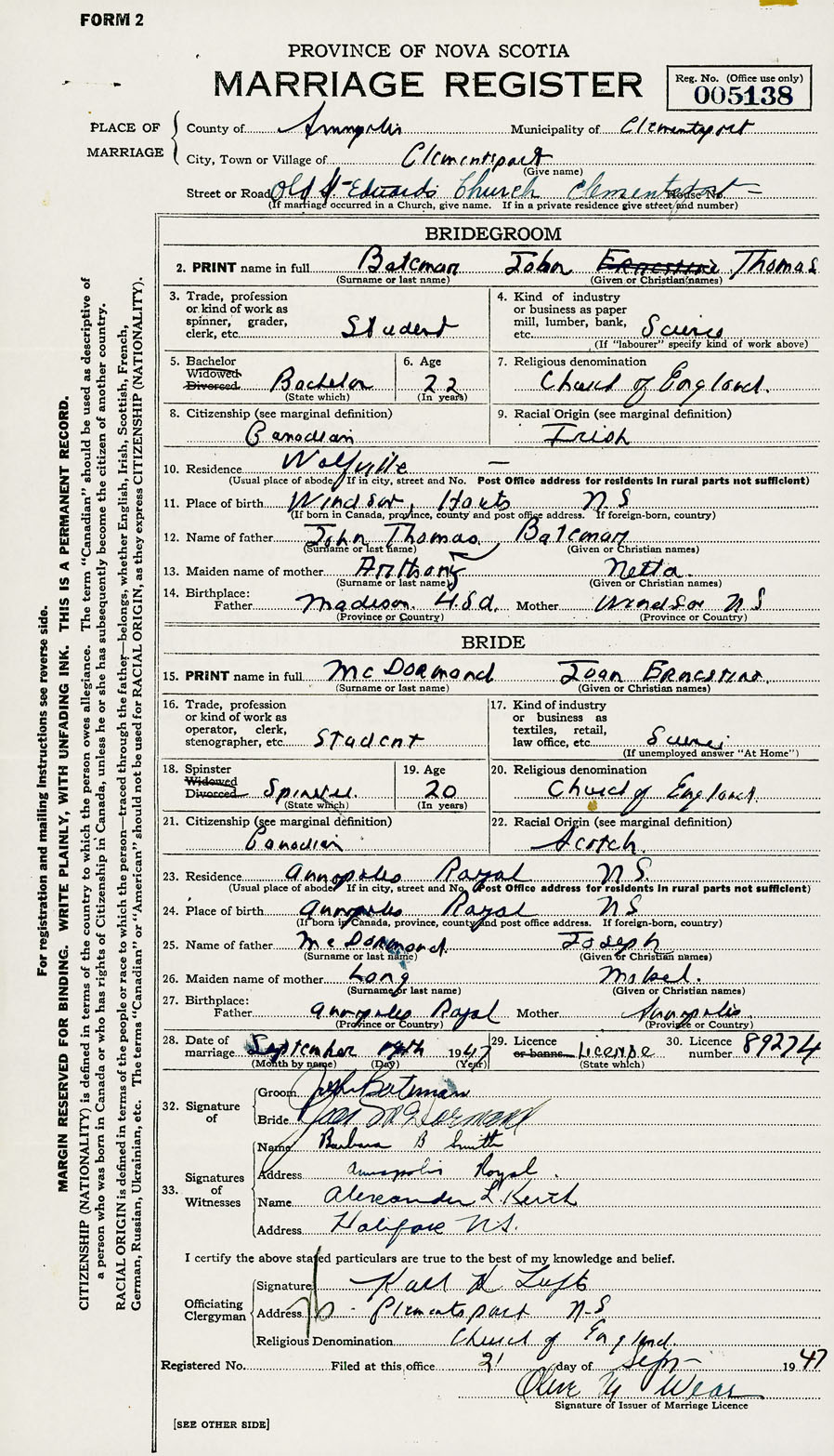 28. Date of marriage September 19 1947 29. By license or banns License 30. License number 89274