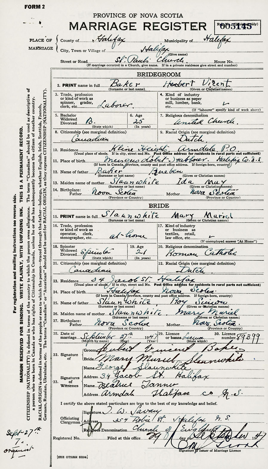 28. Date of marriage September 27 1947 29. By license or banns License 30. License number 89399