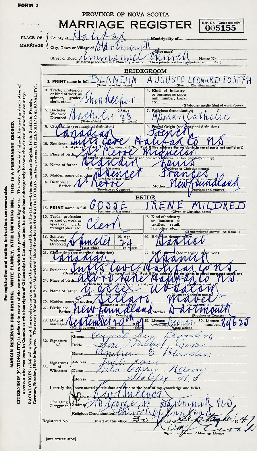 28. Date of marriage September 29 1947 29. By license or banns License 30. License number 89625
