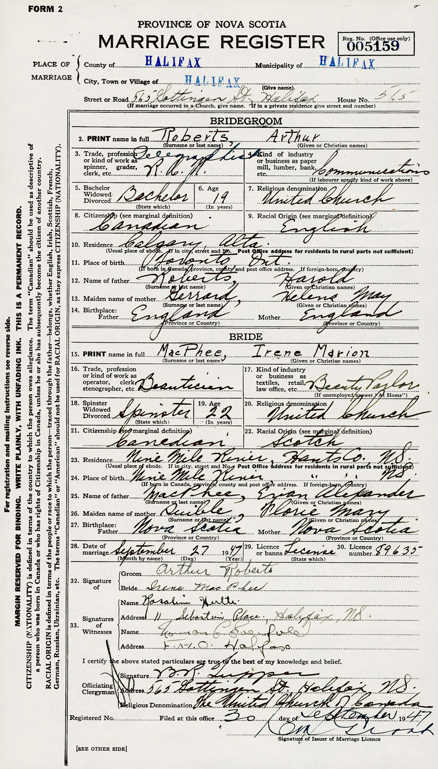 28. Date of marriage September 27 1947 29. By license or banns License 30. License number 89635