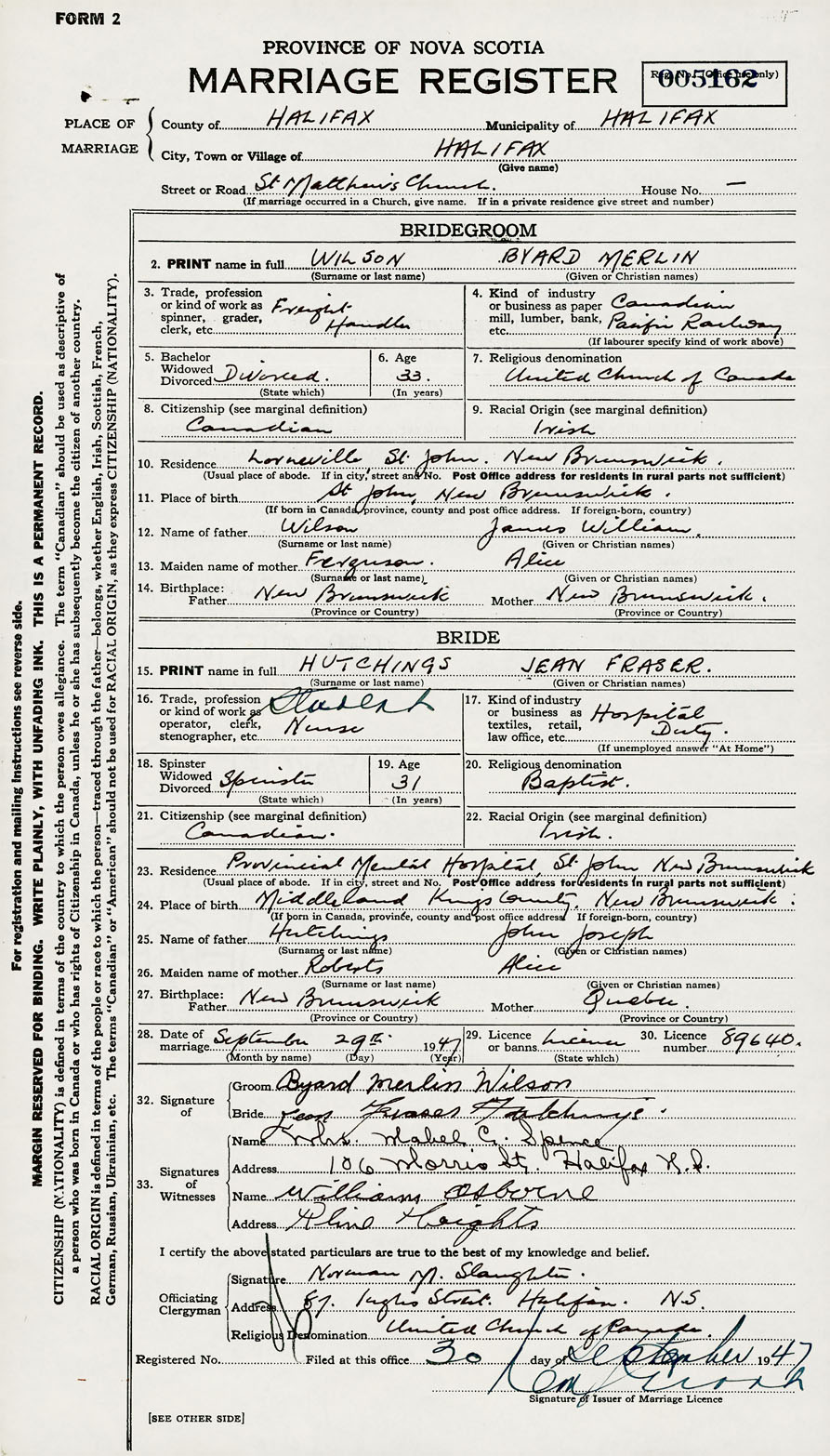 28. Date of marriage September 29 1947 29. By license or banns License 30. License number 89640