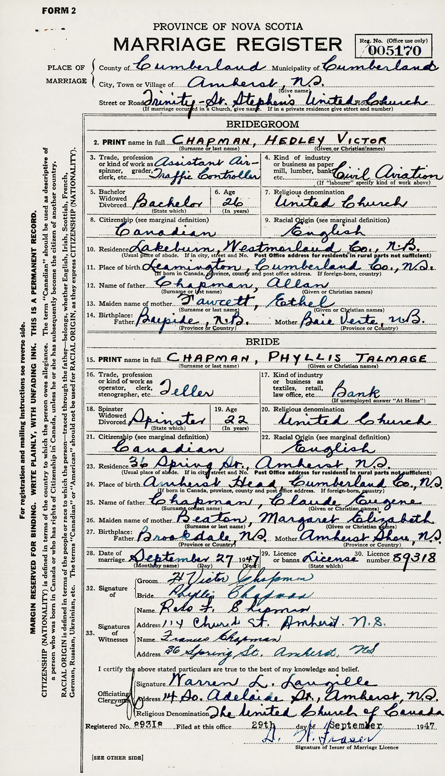 28. Date of marriage September 27 1947 29. By license or banns License 30. License number 89318