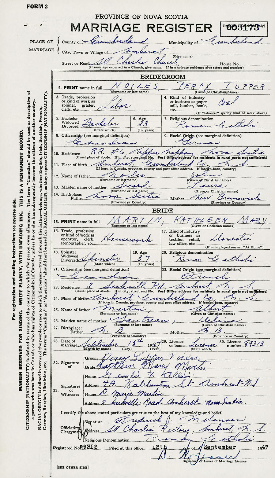 28. Date of marriage September 13 1947 29. By license or banns License 30. License number 89313