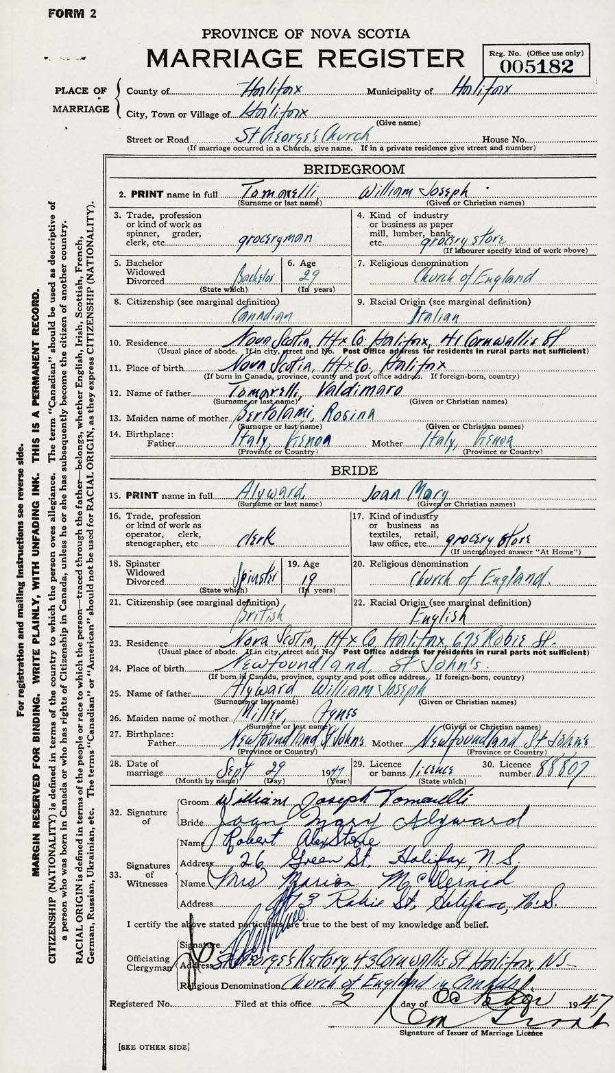 28. Date of marriage September 29 1947 29. By license or banns License 30. License number 88807