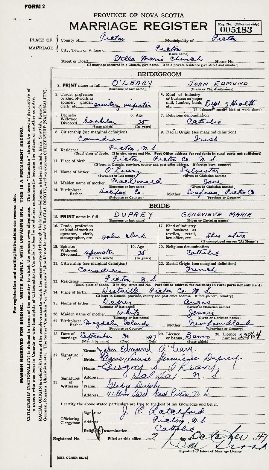28. Date of marriage September 30 1947 29. By license or banns License 30. License number