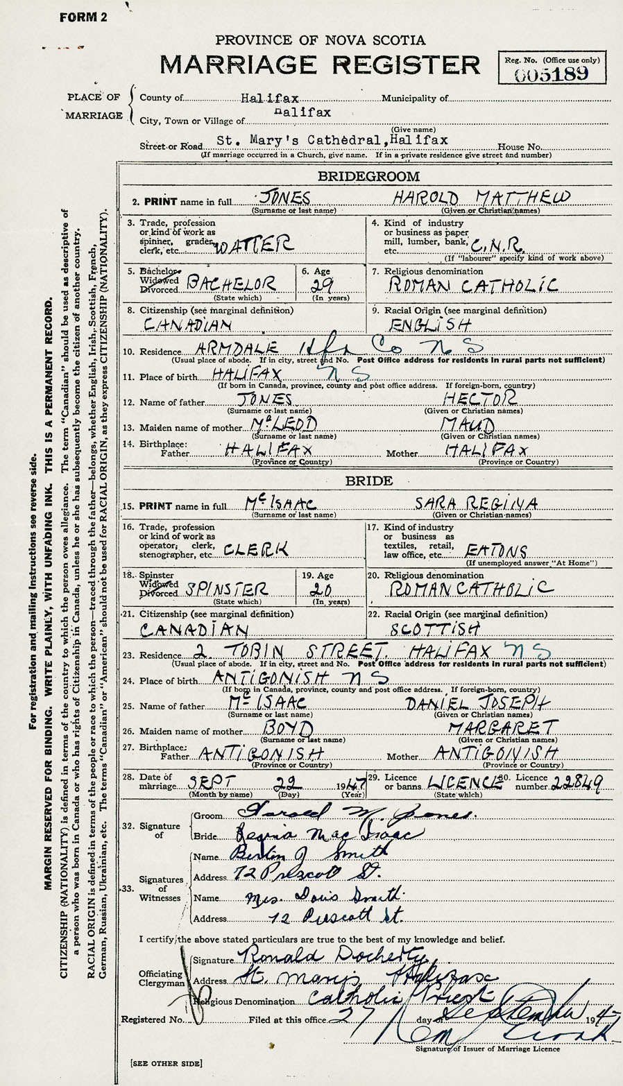 28. Date of marriage September 22 1947 29. By license or banns License 30. License number 22849