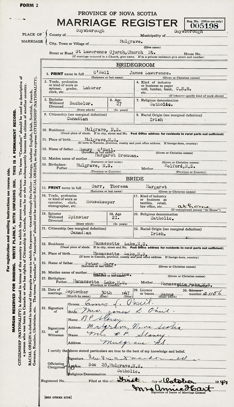 14. Birthplace Father Mulgrave, Nova Scotia Mother Mulgrave, Nova Scotia