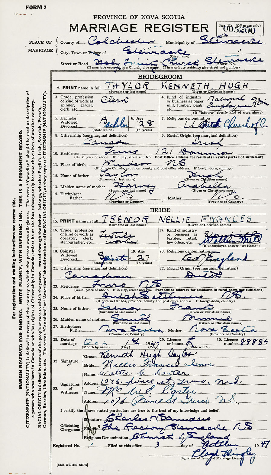 28. Date of marriage October 1 1947 29. By license or banns License 30. License number 88884