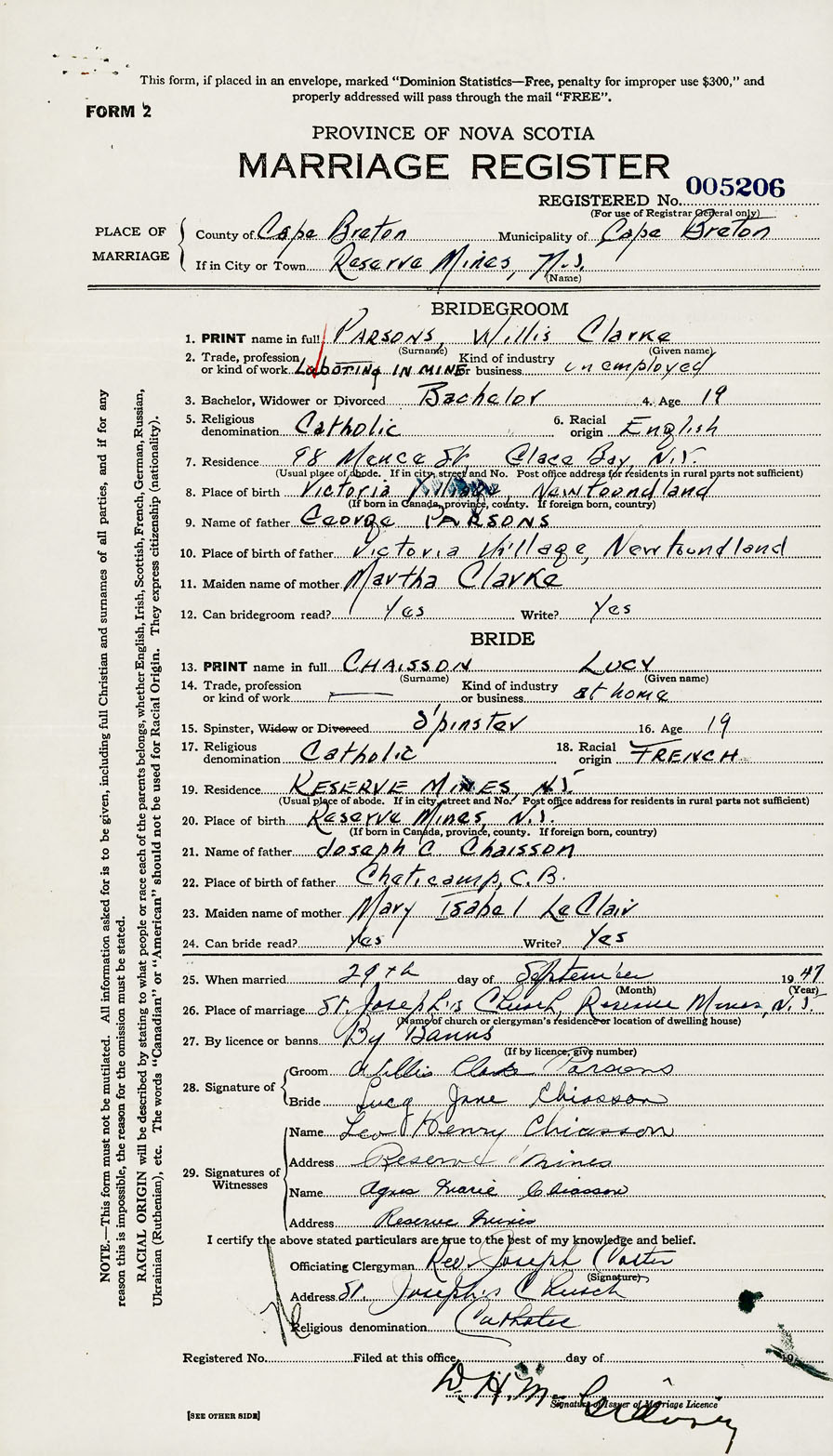 PLACE OF MARRIAGE County of Cape Breton in City or Town Reserve Mines