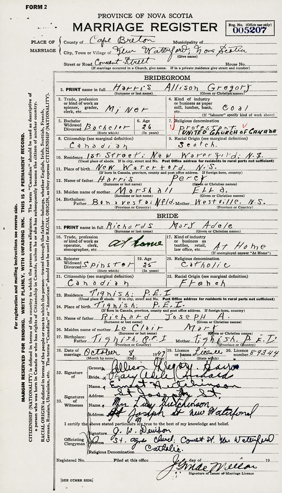 14. Birthplace Father Bonavista, Newfoundland Mother Westville, Pictou County, Nova Scotia