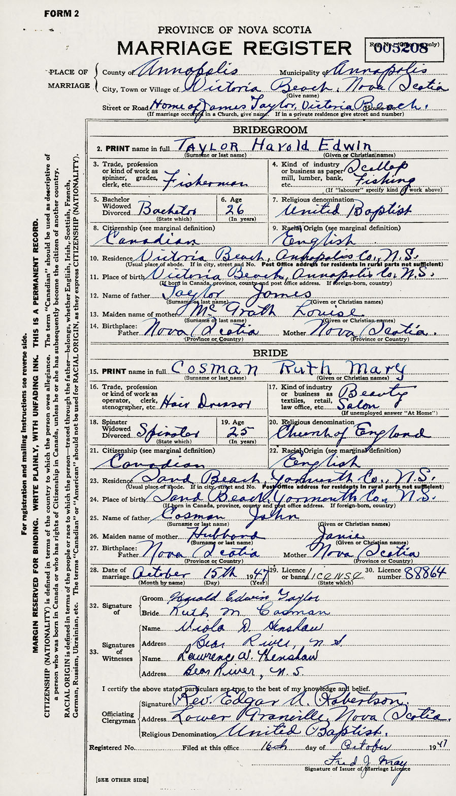 28. Date of marriage October 15 1947 29. By license or banns License 30. License number 88864
