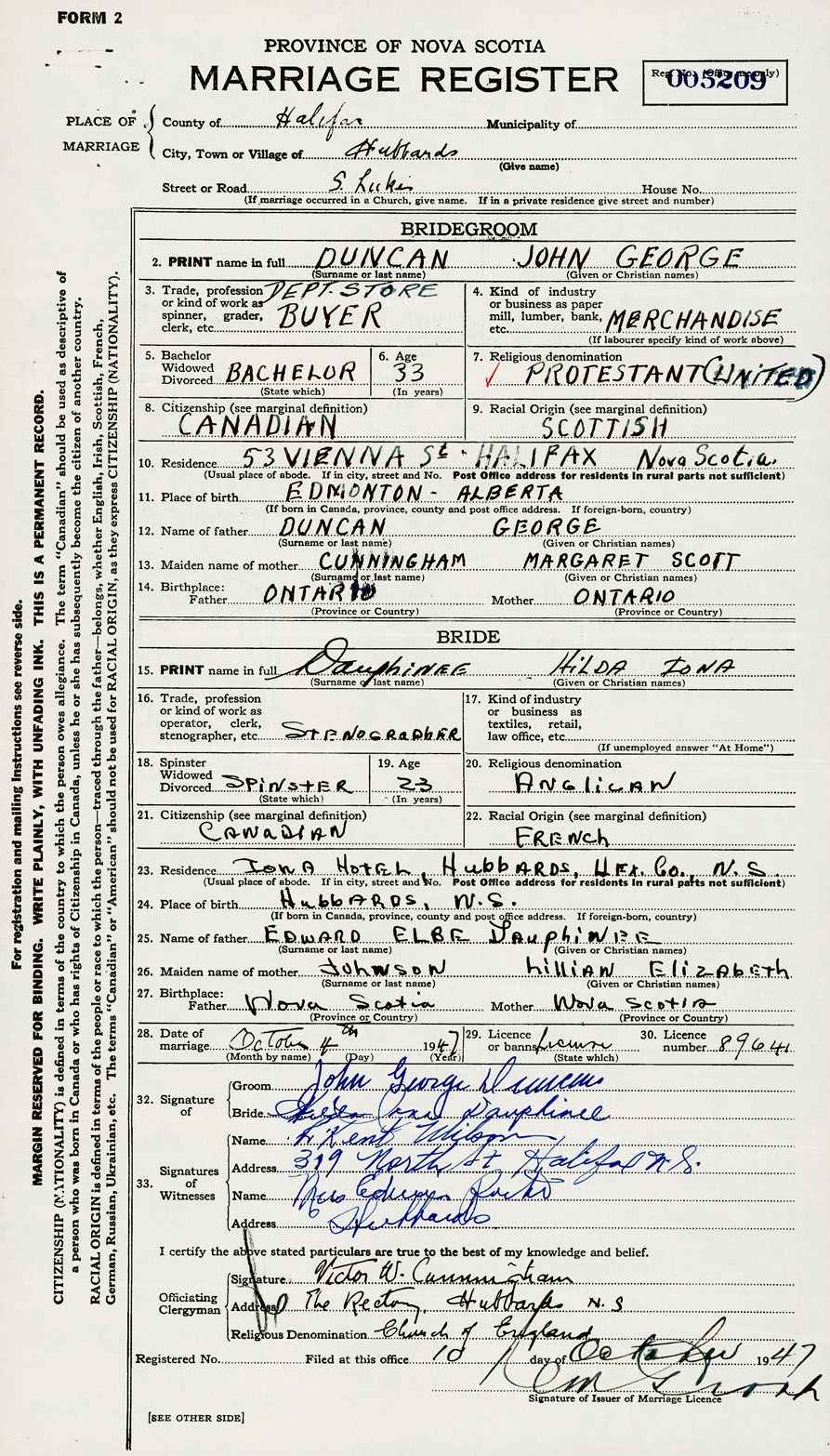 28. Date of marriage October 4 1947 29. By license or banns License 30. License number 89641