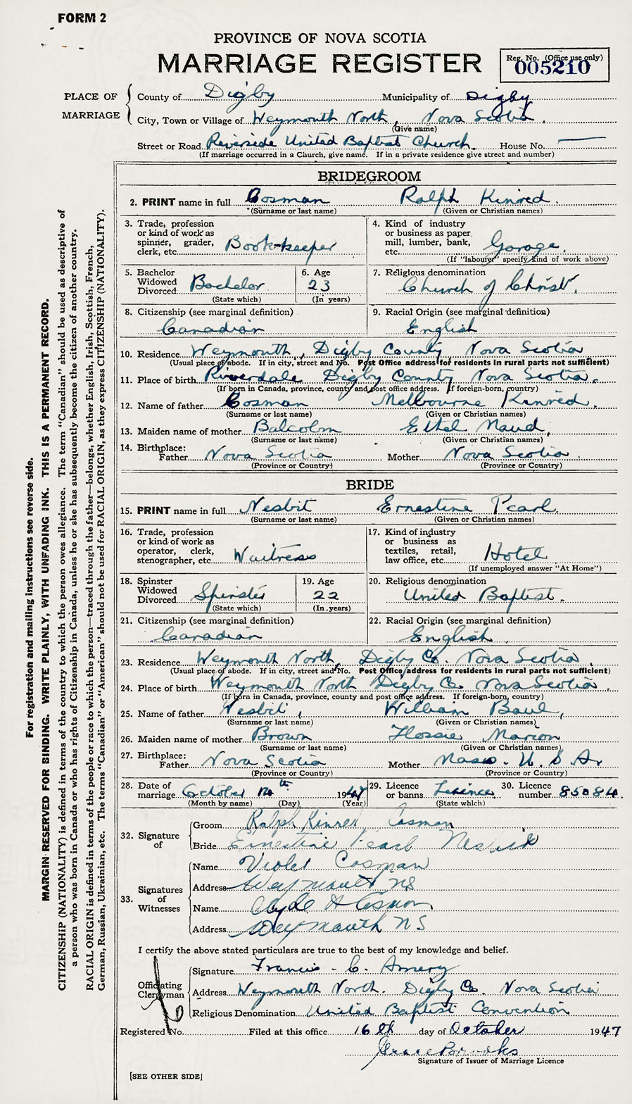 28. Date of marriage October 14 1947 29. By license or banns License 30. License number 85084