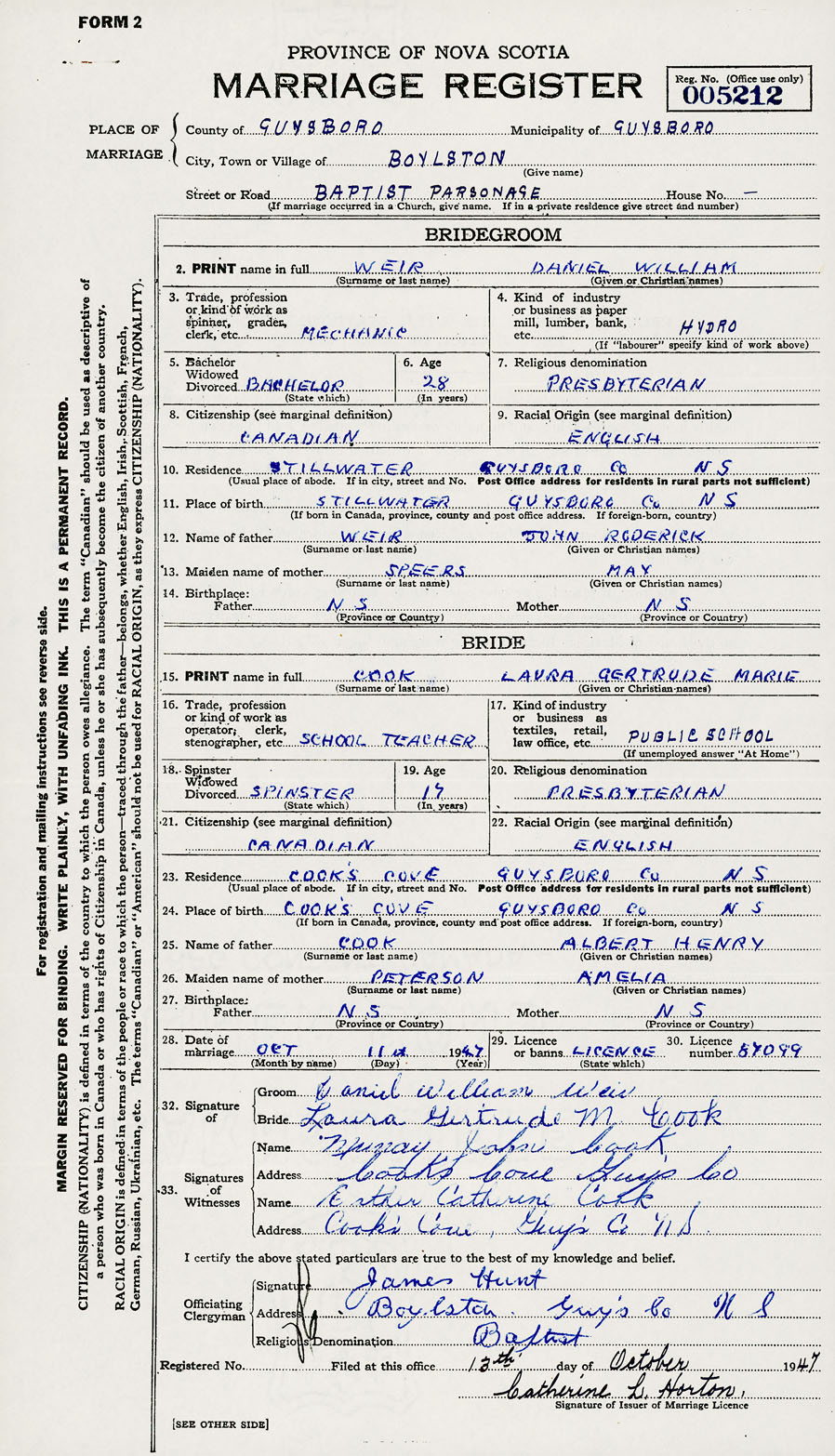 PLACE OF MARRIAGE County of Guysborough