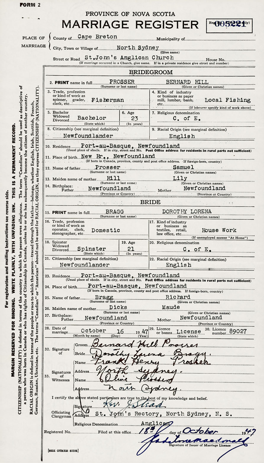 28. Date of marriage October 16 1947 29. By license or banns License 30. License number 89027