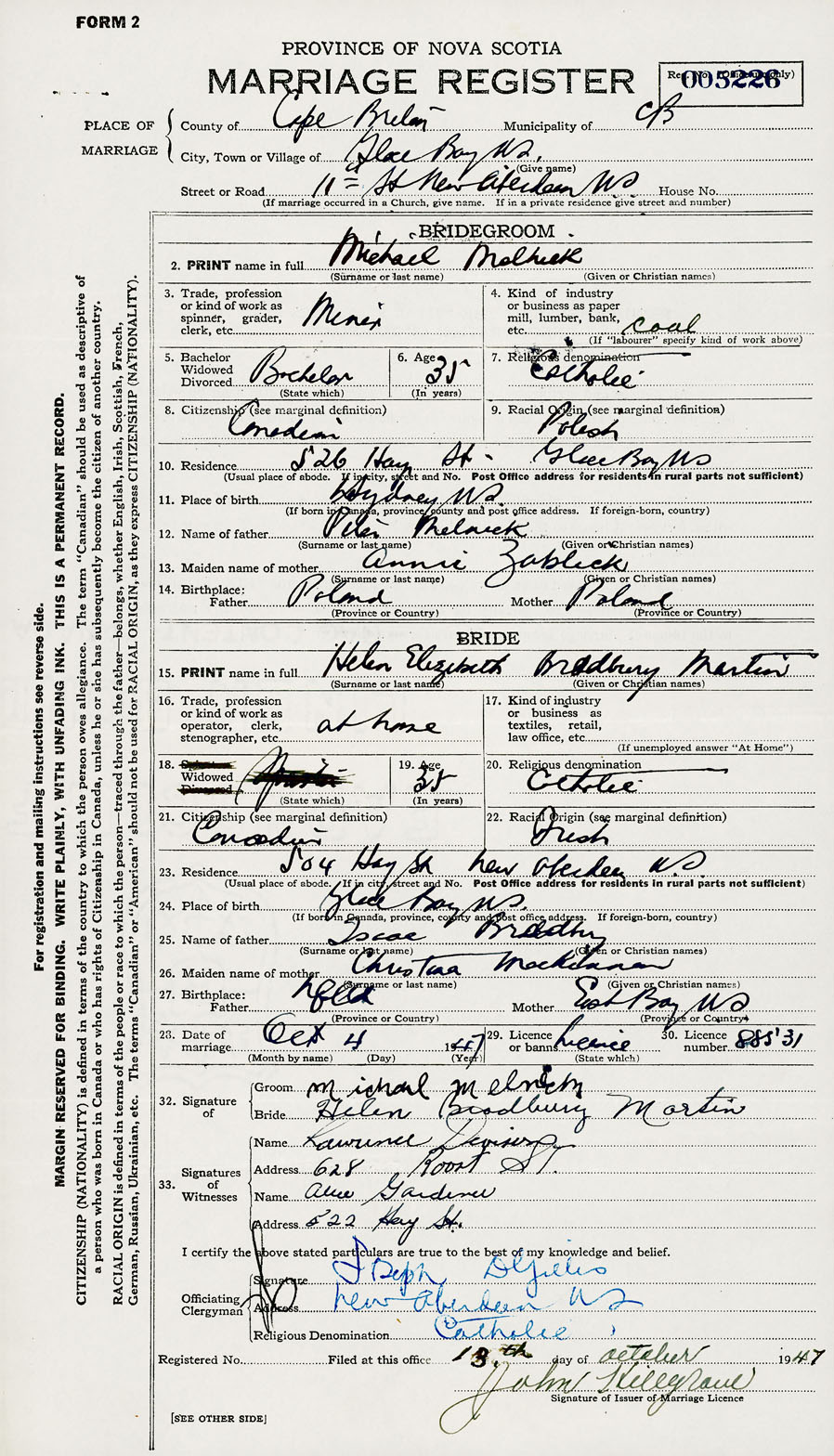28. Date of marriage October 4 1947 29. By license or banns License 30. License number 88531