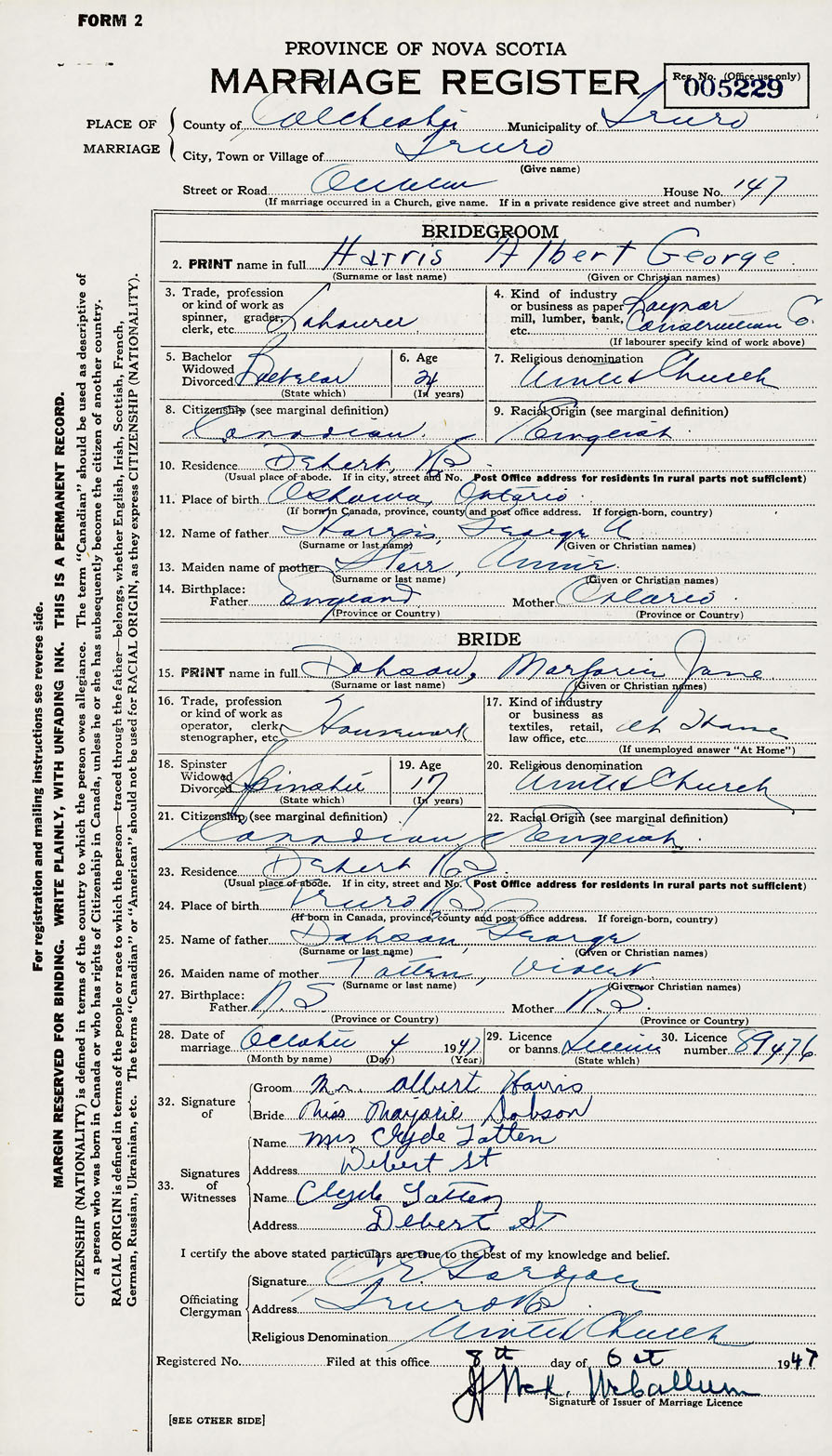28. Date of marriage October 4 1947 29. By license or banns License 30. License number 89476