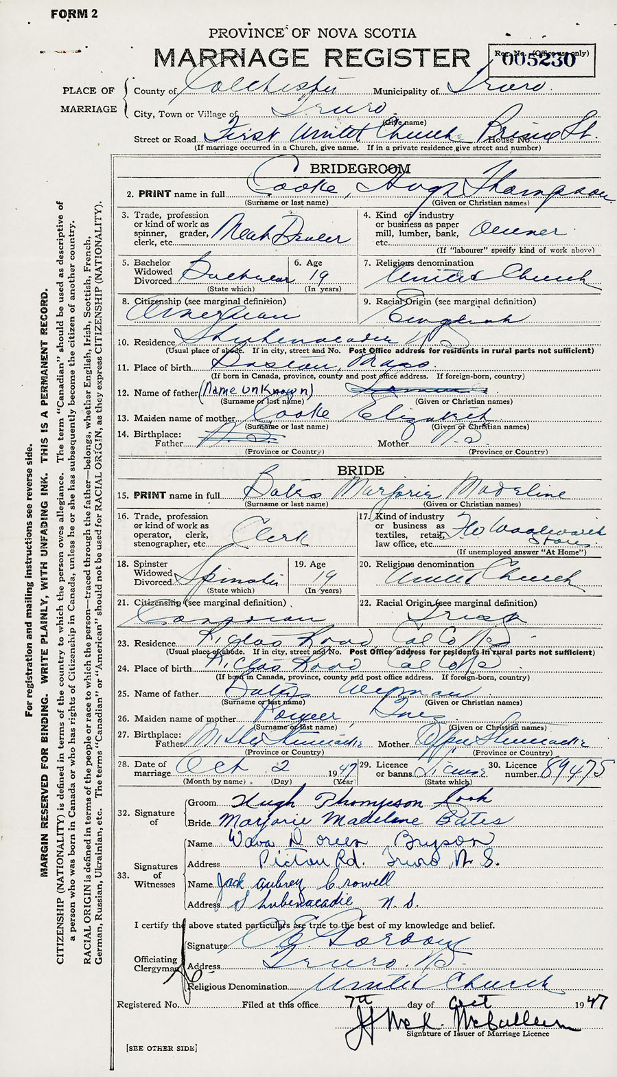 28. Date of marriage October 2 1947 29. By license or banns License 30. License number 89475