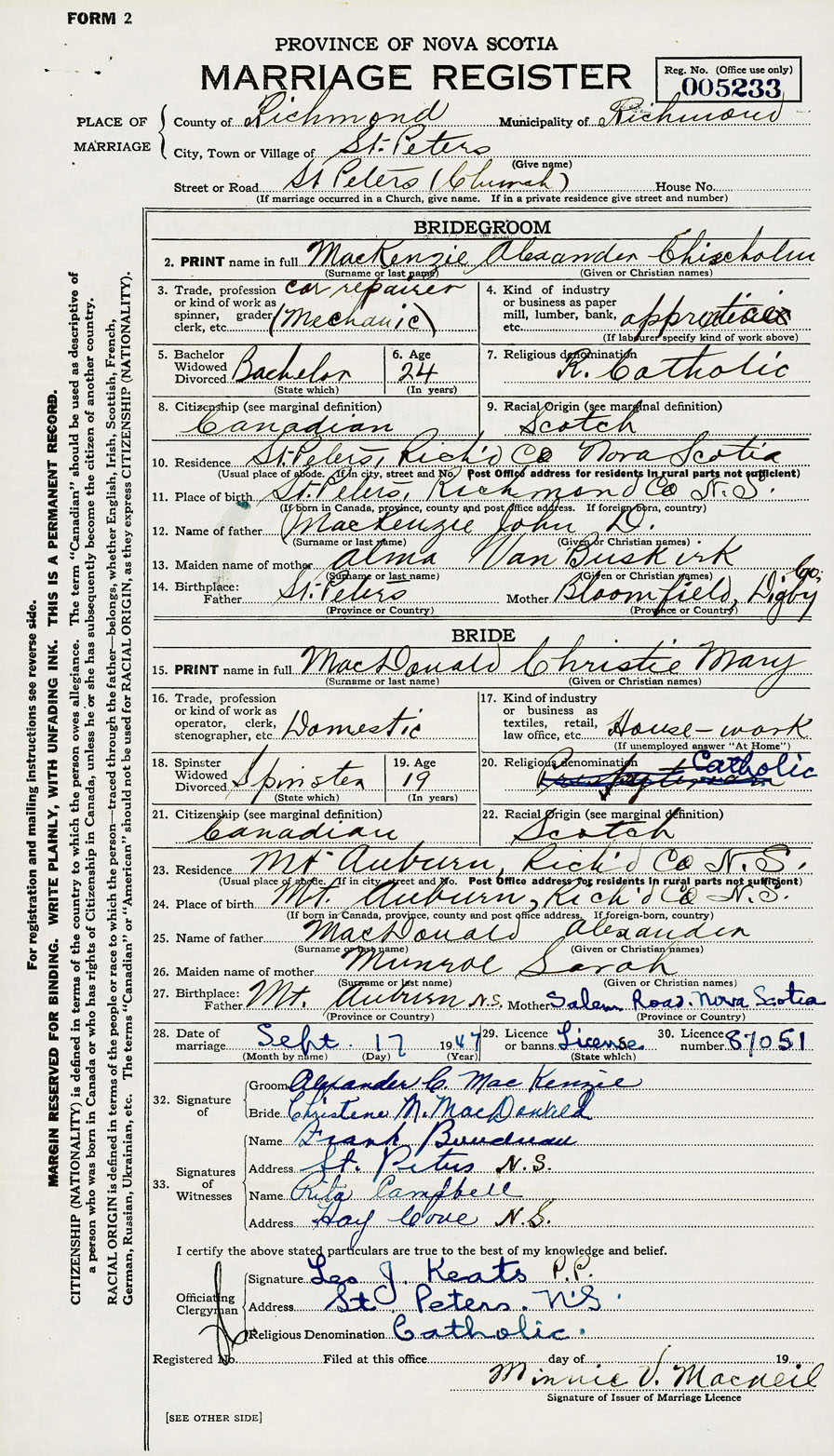 11. Place of birth St. Peter's, Richmond County, Nova Scotia