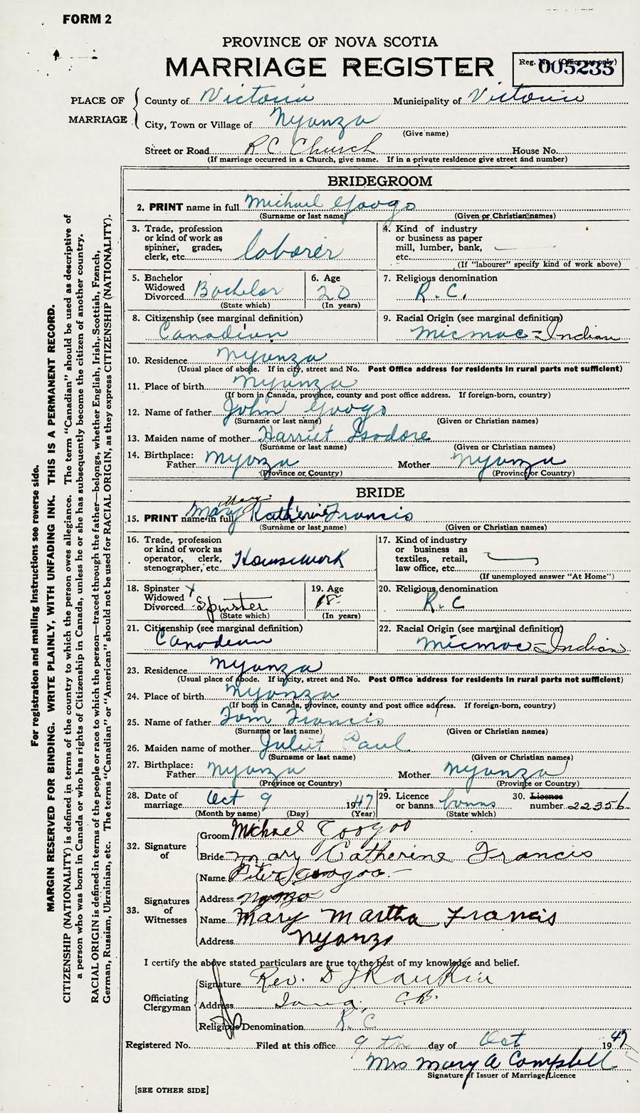 21. Citizenship Canadian 22. Racial origin Micmac Indian