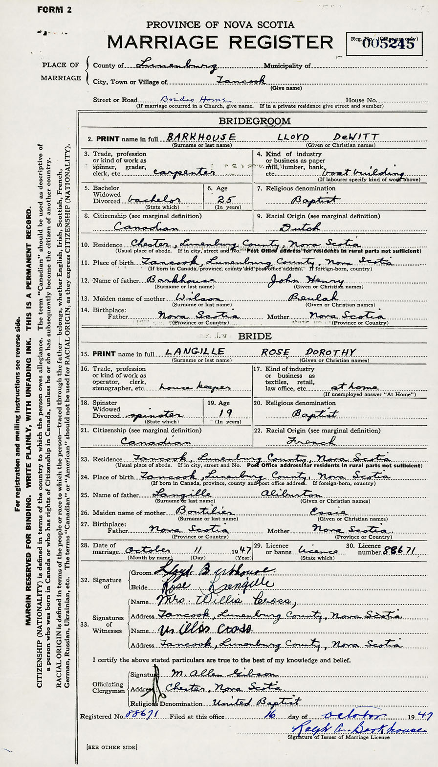 11. Place of birth Tancook, Lunenburg County, Nova Scotia