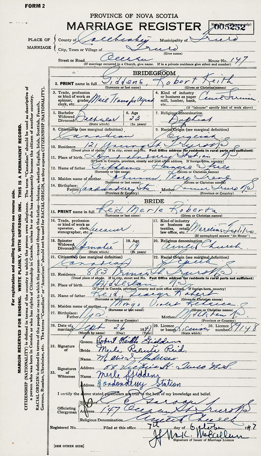 28. Date of marriage September 26 1947 29. By license or banns License 30. License number 89148