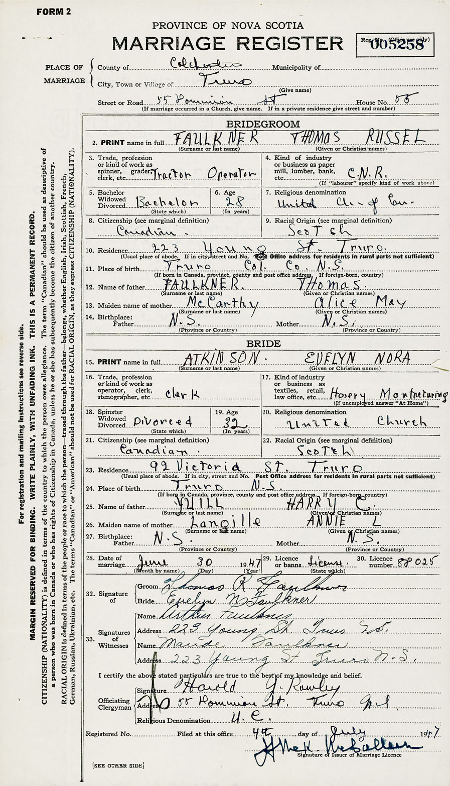 28. Date of marriage June 30 1947 29. By license or banns License 30. License number 88025