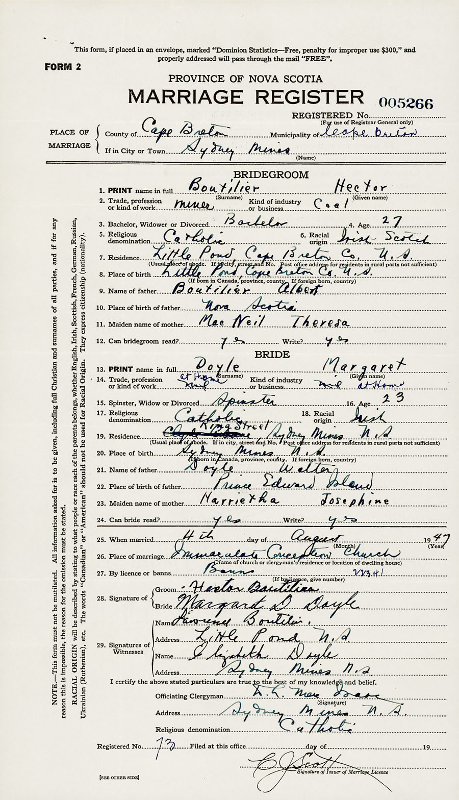 26. Place of marriage Immaculate Conception Sydney Mines, Cape Breton County