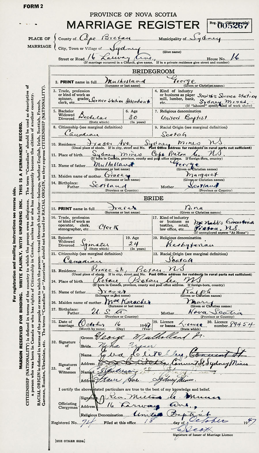 28. Date of marriage October 16 1947 29. By license or banns License 30. License number 89454