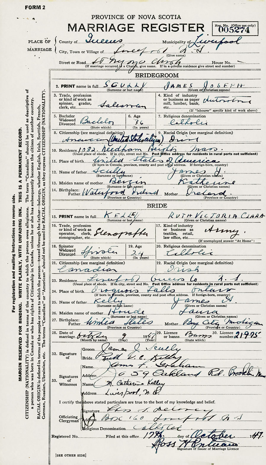 28. Date of marriage October 9 1947 29. By license or banns License 30. License number 21975