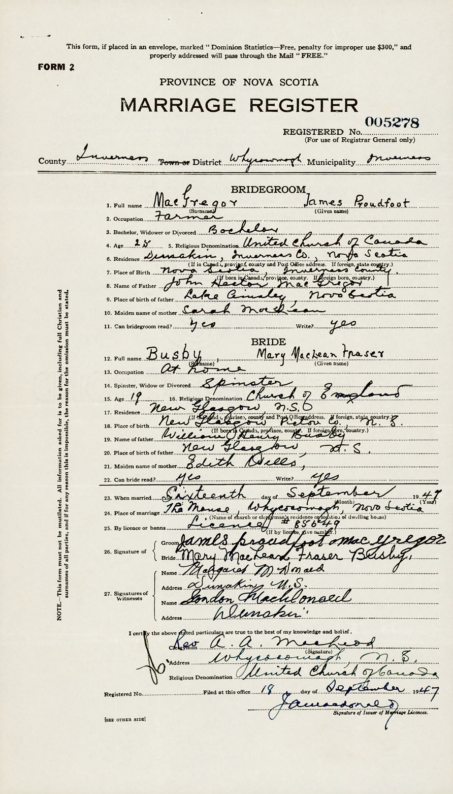 26. Place of marriage The Manse Whycocomagh, Lunenburg County